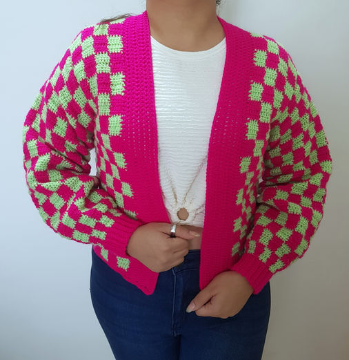 Introducing the ultimate winter wardrobe staple - The crochet checkered bomber jacket! This versatile piece is perfect for keeping you warm and stylish during the colder months & also adds a touch of casual chic to any outfit.